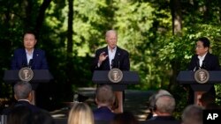 ښاغلي بایډن په ګډ خبري کنفرانس کې د جاپان او جنوبي کوریا د مشرانو سره غونډه مهمه وبلله او دا یې "نوی دور" وباله.